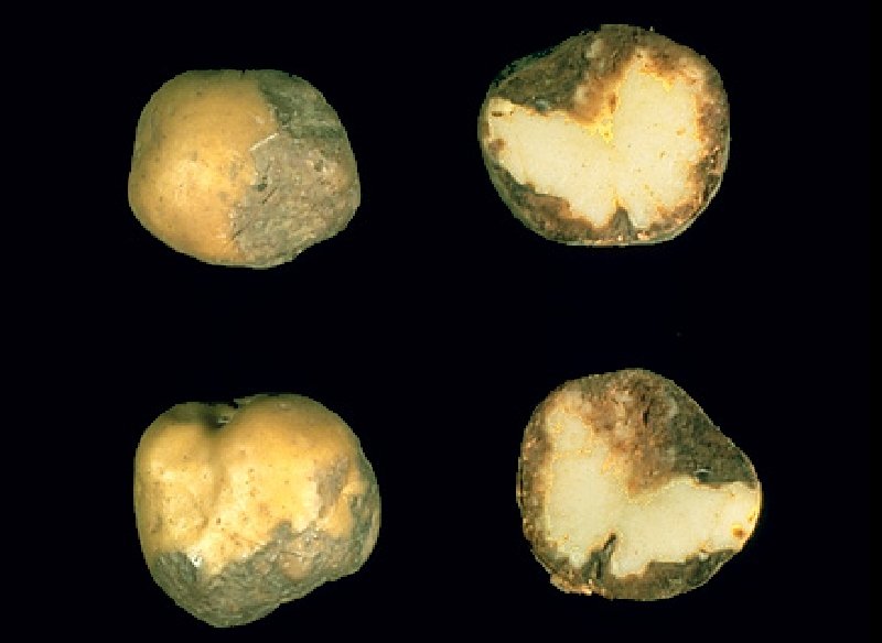 | Belirtiler | Yapraklarda su lekesi, alt yüzeyde beyaz küf, yumruda kahverengi çürüme |