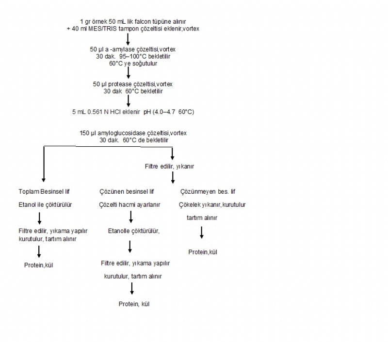 Not: Analiz, örnek miktarı ve buna bağlı olarak kimyasalların miktarları 4'e bölünerek yapılabilinir (denenmiştir). Hangi firmanın enzimleri kullanılacak ise enzim aktiviteleri nedeniyle enzim miktarları firmanın belirttigi miktarlarda kullanılmalıdır. Protein analizi, sonucun genellikle 0 çıkması nedeniyle yapılmamaktadır.