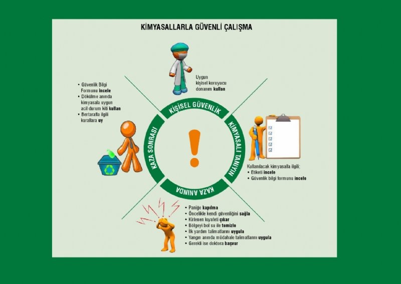 Bu nedenle aşağıda resimde belirtilen laboratuvar çalışma ilkelerine harfi harfine uymak hem analizi yapan kişi için, hem de laboratuvardaki diğer çalışanlar için önemlidir. Bu bölümde sadece et laboratuvarında değil, genel olarak kimyasal analizlerin gerçekleştirildiği gıda laboratuvarında uyulması ve dikkat edilmesi gereken hususlar tekrarlanmıştır. Ayrıca; insan sağlığına zararlı kimyasallar ve laboratuvar kazalarında ilk yardım hakkında detaylı bilgiler verilmiştir.