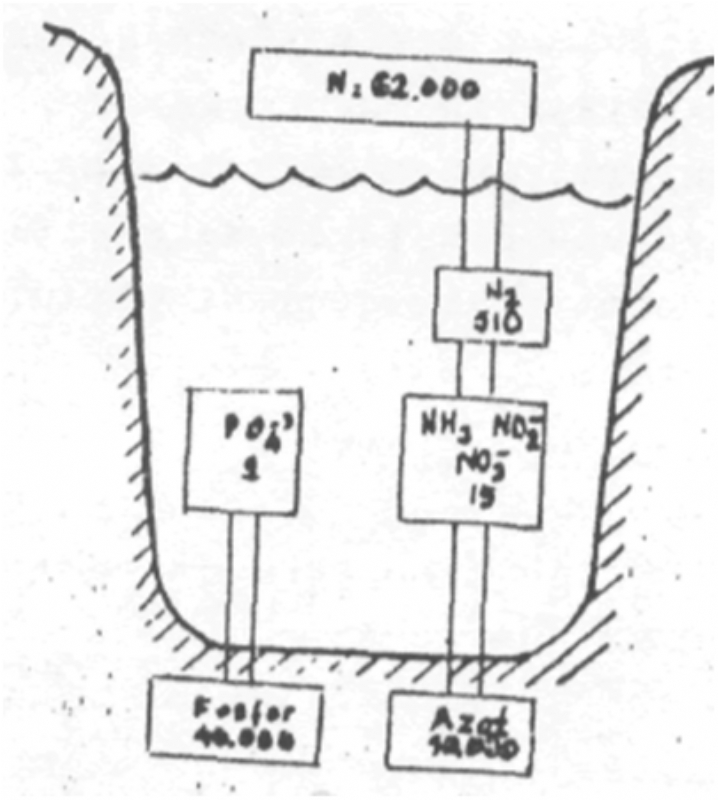 Aşağıdaki şekilde görüldüğü gibi her bir çözünmüş inorganik fosfor atomuna karşılık takriben 15 çözünmüş azot atomu bitki bünyesinde kullanılır. Yosunlarda bu mineralin stokiyometrik oranları 15 / 1 civarındadır. Doğal sularda biyolojik olarak bu iki minerale göre dengelenmiştir. Suda kolaylıkla kullanılabilen 15 atom azota karşılık 510 atom çözünmüş moleküler azot ve suyun üstündeki atmosferde ve altındaki sedimentte de başlıca ve çok miktarda azot vardır. Atmosferik azotun tespit edilme hızı ve organik azot birikintilerinin parçalanma hızının yavaş oluşu nedeniyle azot ancak sınırlı bir şekilde sudaki bitkiler tarafından kullanılabilir.