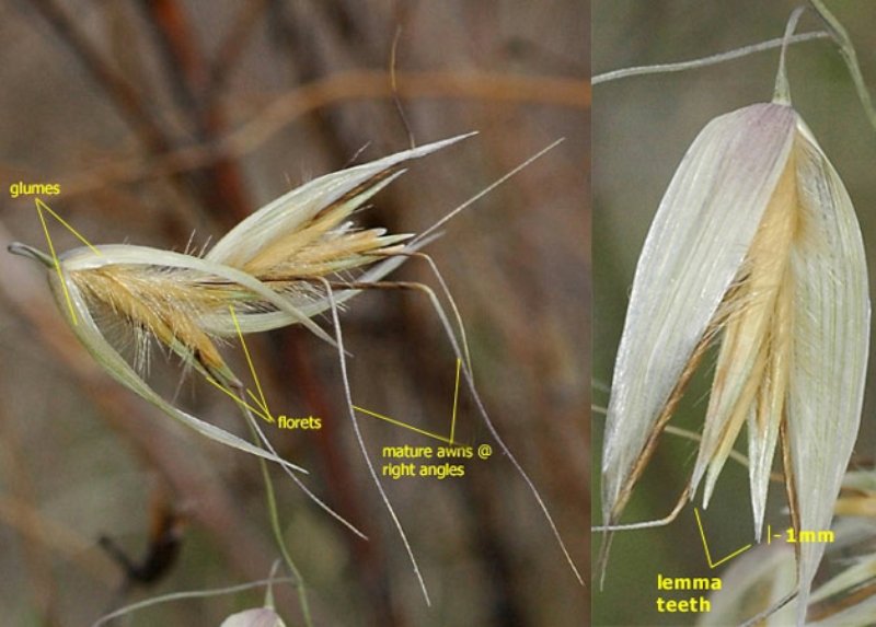 Tohumlarının üzerinde tipik olarak bükülmüş ve dirsekli uzun bir kılçık (awn) bulunur.