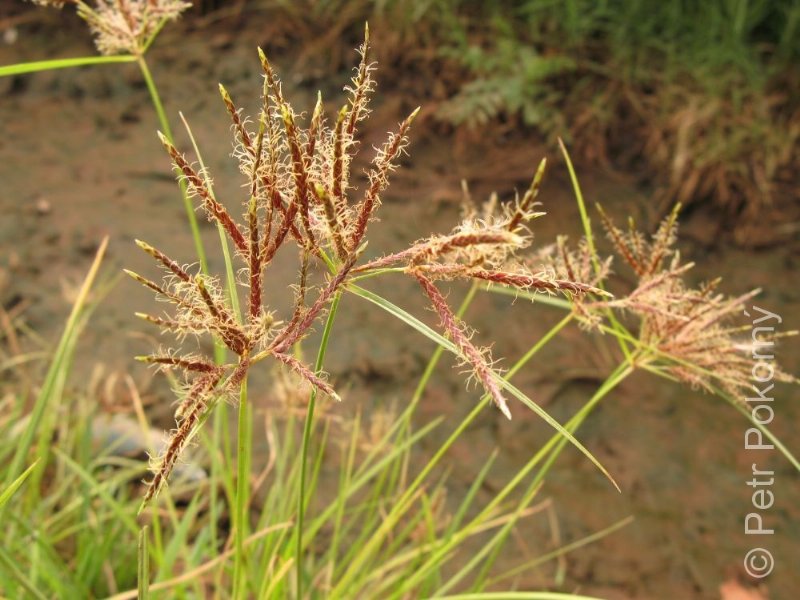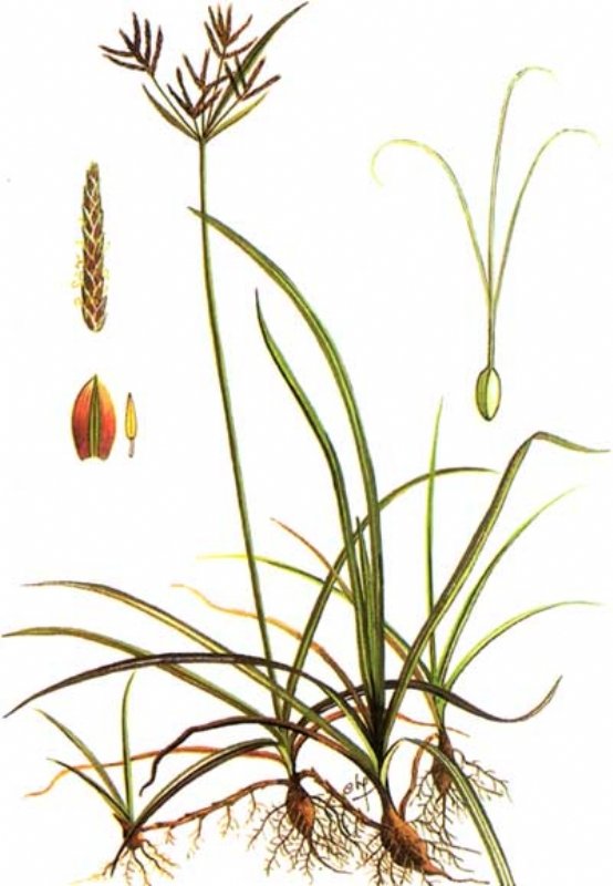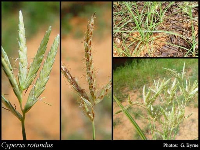 Cyperus rotundus L. Sinonimi: Chloracyperus rotundus (L.) Palla, Cyperus odoratus Osbeck, C. olivarııs Targ. et Tozz., C. tuberosus Roxb., Pycerus rotundus Hayek