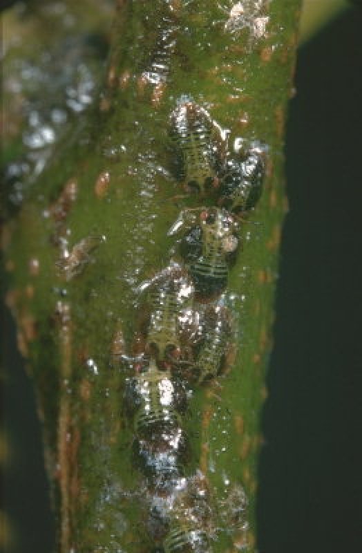 Erginler açık kahverengi, sarımsı turuncu kahve renklidir. Kanatları saydam olup abdomen üzerinde çatı şeklinde katlanmıştır. Kışı ergin olarak ağaçların kabuk çatlakları, yarıkları gibi korunaklı yerler, tomurcuk çevresi, dal çatlaklarında ve yerdeki yaprak altları, artıklar arasında geçirir. Erginler yumurtalarını tomurcukların dibindeki sürgünlere, yaprak sapı ve çiçek saplarına bırakırlar.