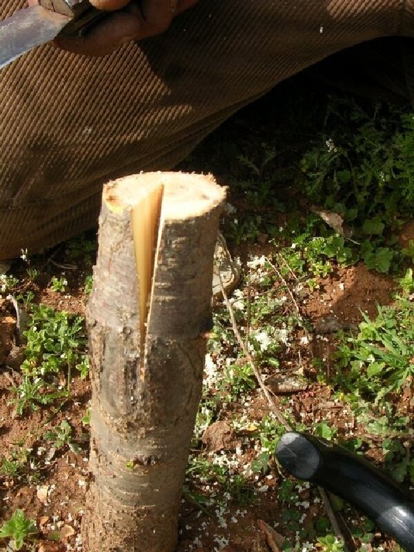 Daha sonra anaçta keskin bir bıçakla V şeklinde bir kesit yapılır. Bu kesitin içi boşaltılarak kalemin takılmasına uygun hale getirilir. Yaklaşık 10-15 cm uzunlukta ve üzerinde 2-3 göz bulunan aşı kalemlerinin dip kısmı da V şeklinde kesilir. Hazırlanan kalem anaçtaki yere kabukları çakışacak şekilde yerleştirilir. Daha sonra açık yüzeyler aşı macunu ile kapatılır. Bu aşıda anacın kalınlığına bağlı olarak bir anaca birden fazla kalem takılabilir