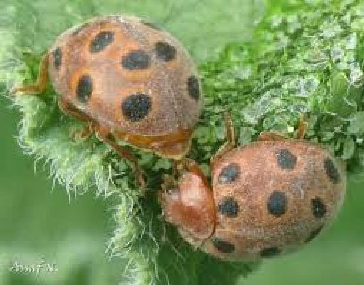 Erginleri 7-9 mm boyunda şekil ve renk olarak Yedi noktalı gelinböceği (Coccinella septempunctata)'ni benzemektedir. Gelin böceğinden daha iri ve bakır kırmızısı rengindedir. Kanatlarının üzerinde toplam 12 adet siyah leke bulunur. Larvaları geniş ve oval olup kavuniçi renkte üzeri, oldukça sert yapıda dikenimsi kıllarla kaplıdır. Yumurta 1.5-2.0 mm boyunda, uzunca ovaldir. İlk bırakıldıklarında parlak sarı olan renk daha sonra portakal sarısına dönüşür.