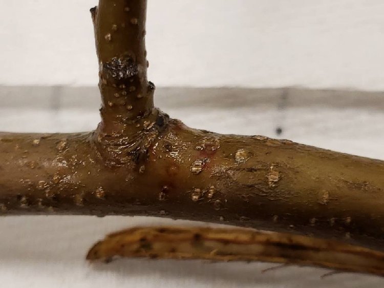Dallar ve meyveler üzerinde gri kabuklar ve meyve yüzeyinde kırmızı lekeler en belirgin işarettir.