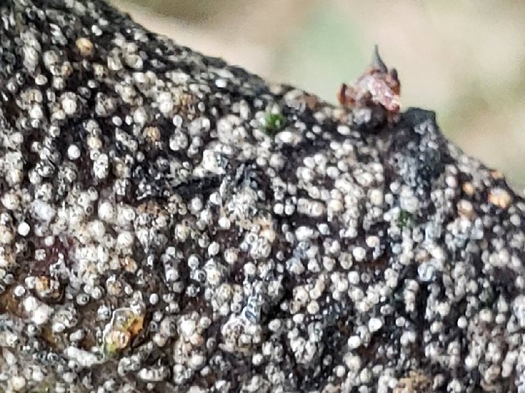 Dallar üzerinde gri-siyah kabuklar hâlinde yoğun bir görünüm alır.