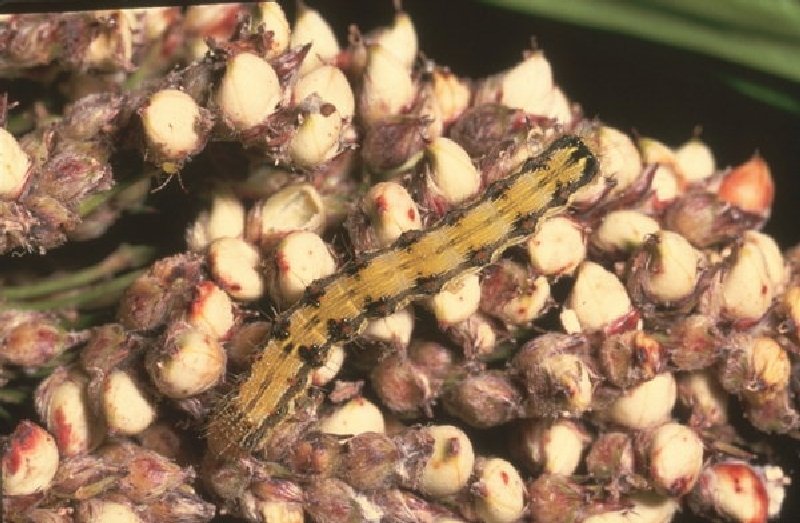 Yumurtadan yeni çıkan küçük larvalar, genç yaprakların ve sürgün uçlarının etli kısımlarını yiyerek zarar verir.