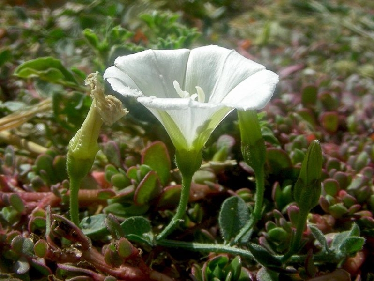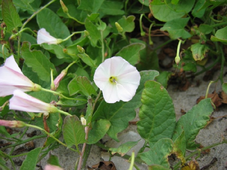Yapraklar basit, stipülsüz, uzun saplı, tüysüz veya çok tüylü-dür.. Çiçekler 1.5-2.5 cm büyüklükte, hafif pembemsi veya morumsu beyaz, huni şekilli uzun saplıdır. Çiçek sapı 5 cm kadardır. Meyve, 6-8 mm çapında, küresel olup her kapsülde 1-4 tohum bulunur. Tohum, 4-5 mm uzunlukta ve üç köşelidir. Tohum rengi, koyu kahverengiden siyaha kadar değişir. Tohum kabuğu, sert ve tüysüzdür.