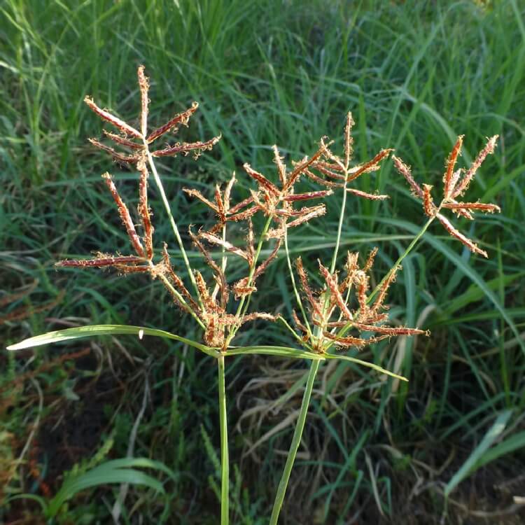 Çiçeklenme: Çiçekler, gövde ucunda, morumsu-kahverengi renkte, şemsiye benzeri kümeler (spikletler) halinde toplanmıştır.