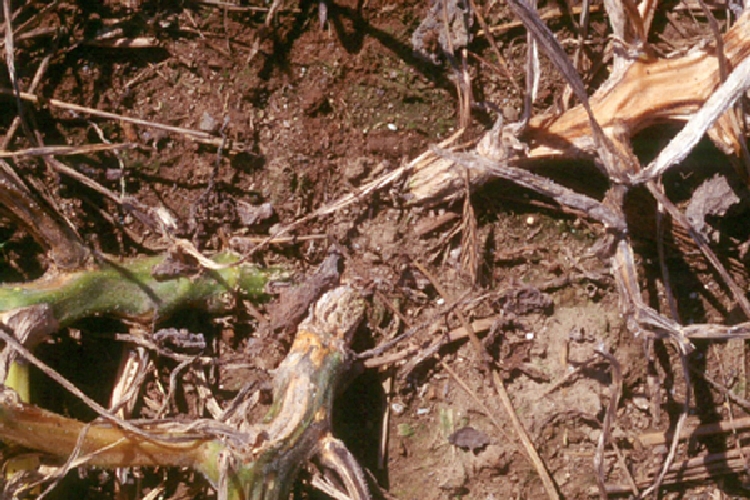 Tarla koşullarında ilk farkedilen belirti yaprakların solmasıdır. Bir kaç gün içerisinde, tüm bitkiler solmakta ve ölmektedir. Bitkinin diplerinden topraklar uzaklaştrılırsa, köklerde çok belirgin bir nekrotik leke görülebilir. Kökler ilk önce açık bir renkte ve suda ıslanmış bir görünüm arzeder, daha sonra bu lekeler koyulaşmaktadır. Hastalık köklerin kortex (kabuk) kısmından başlar, korteks dokunun çürümesine neden olur ve sonuçta iletim demetlerine ait iplikçikler hariç diğer dokuları tamamen çürütür. İnfekteli bitkiler toprak seviyesinden yaklaşık 2-4 cm aşağıdan kırılabilir.