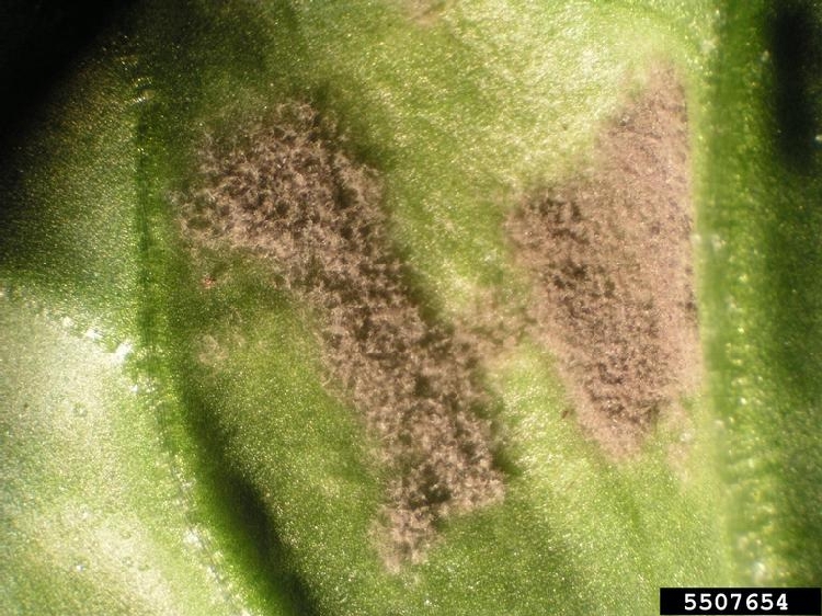 Yaprağın alt yüzeyinde bu lekelerin karşısında grimsi–mor renkli küf tabakası (spor örtüsü) oluşur.